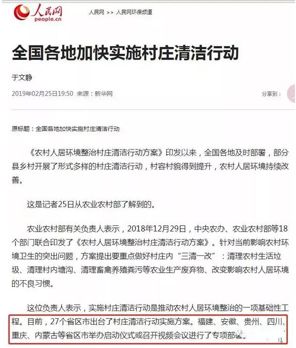 2月25日人民網(wǎng)發(fā)布,自《農(nóng)村人居環(huán)境整治村莊清潔行動方案》印發(fā)以來,已有27個省區(qū)市出臺了村莊清潔行動實施方案。福建、安徽、貴州、四川、重慶、內(nèi)蒙古等省區(qū)市舉辦啟動儀式或召開視頻會議進行了專項部署。
