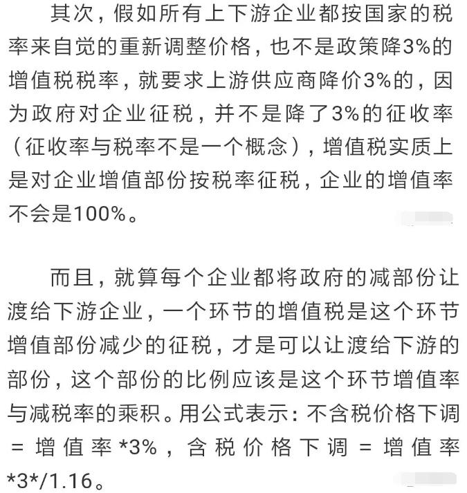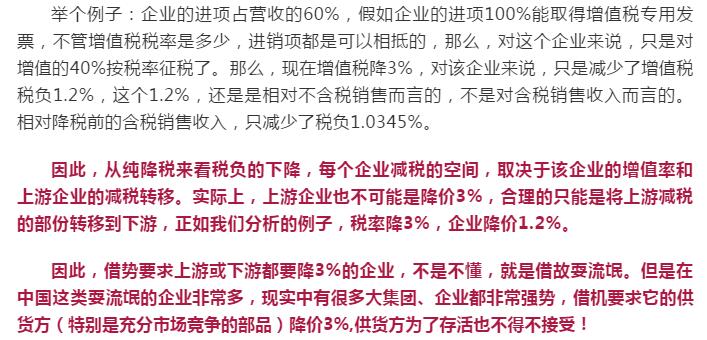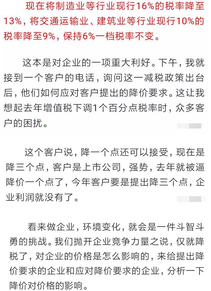 導語:這兩天估計很多朋友都被這段文字刷屏了:增值稅稅率,4月1日起將由16%改成13%。請:之前與我司有合同16%稅率發票的客戶,將款項轉入我公司賬戶,以便我司近期將16%發票開給您。合同簽約未付款或只付了預付款的,四月一日起發票稅率自動改成13%,我司不承擔差價! 如果你的客戶要求你的產品降價怎么辦?是降還是不降? 1、增值稅從16%降至13%,包裝廠利潤將直線上升40% 這樣的減稅,對于企業的發展無疑是重大的利好消息! 有人測算過,增值稅減3%,企業利潤可以提升44.8%。 啥,降低3%的增值稅能提升44%的企業利潤,你在開玩笑吧,這怎么可能? 例如一家工廠A,采購了價值300萬元的原材料,收到了300萬元的增值稅發票,這個發票是原材料廠商提供給他的。 然后,這家工廠生產的產品,以1000萬元售出,那么他需要以1000萬為基數繳納增值稅,抵扣掉300萬的進項,實際需要為700萬元繳納增值稅,以16%計算,需要繳納112萬元。 那么這700萬是不是工廠的利潤呢?當然不是,扣除銀行貸款、工人工資、設備折舊等,一年能賺50萬就不錯了。中國制造業的平均利潤占營收的比例,為3.3%。 如果增值稅率從16%降低到13%,就能給工廠A帶來額外21萬的利潤,企業利潤可不是直線上升40%么? 2、稅率下調3%后,客戶借機要求降價3%,怎么辦? 這一減稅政策出臺后本是對制造企業的一項重大利好,但有不少老板反映,他們的客戶借機提出了降價要求。基于政府提出增值稅從16%降至13%,降了3個百分點,所以價格方面是否也能降低3個點。 從感覺上來說,似乎給客戶降價3%是合理的,但從直覺上又覺得簡單降價3%不太對。感覺不對,有點亂,得捋一捋。那小編來給大家算一下這筆賬,現在假設你的采購成本是100元,成交價是120元: 如果按照原本16%增值稅率: 進項稅是100*0.16=16元, 出項繳稅是120*0.16=19.2元, 納稅額為:19.2-16=3.2元。 實際利潤為120-100-3.2=16.8元。 按照新的增值稅為13%: 進項稅是100*0.13=13元, 出項稅是120*0.13=15.6元, 納稅額為:15.6-13=2.6元, 實際利潤為120-100-2.6=17.4元。 這意味著降低增值稅,讓老板們少繳納了17.4-16.8=0.6元增值稅。 但如果你給客戶降價3%,成本價還是100元,而成交價是120*(1-3%)=116.4元。 按新的13%增值稅率, 進項稅是100*0.13=13元, 出項繳稅是116.4*0.13=15.132元, 實際進項抵扣后, 納稅額為:15.132-13=2.132元。 實際利潤為116.4-100-2.132=14.268元。 這比原來未降價未減稅 少賺了16.8-14.268=2.532元, 利潤減少了15.1%! 這不算不知道,算了嚇一跳。 不是說好降3%的嗎? 怎么利潤一下降了15%? 其實在你給客戶降價的情況下, 如果你的供應商沒有給你同時降價, 那么你的利潤將損失將近15%。 所以, 買賣有風險,降價需謹慎。