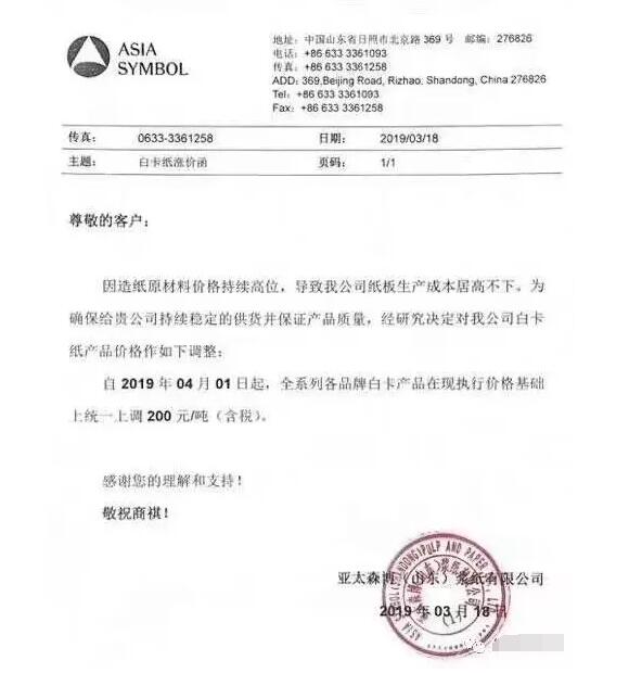 亞太森博(山東)漿紙有限公司:因造紙原材料價格持續高位,致我公同紙板生產成本居高不下,為確保給公司持定的供貨并保證產品質量,經研究決定對我公司白卡紙產品價格作如下調整:自2019年4月01日起,全系列白卡紙產品在現執行價格基礎上統一上調200元/噸(含稅)。
