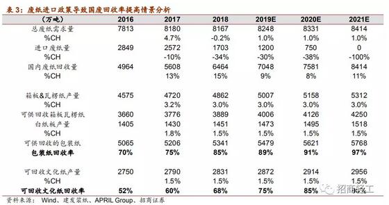 導語:根據近來龍頭紙企發布的2018年度業績報告來看,不少紙企2018年盈利情況差強人意,對此,不少紙企皆表明是受廢紙價格上漲、原紙價格漲不動所致。那么,為何18年廢紙進口量減少,紙價卻漲幅甚微?為何紙業企業近期庫存較高,但依然有信心提價? 龍頭紙企2018年度業績差強人意,行業景氣度走低 根據近來龍頭紙企發布的2018年度業績報告來看,不少紙企2018年盈利情況差強人意,對此,不少紙企皆表明是受廢紙價格上漲、原紙價格漲不動所致。 早在2016年之時,我國造紙業曾迎來了短暫的“春天”,呈現出了異常繁榮的市場行情。數據顯示,2016年全國紙及紙板生產量10855萬噸,同比增長1.35%;消費量10419萬噸,同比增長0.65%。37家紙業上市公司中有32家營收取得增長,實現營收突破2000億元達2204.14億元,相比于2015年的1991.60億元,增長了10.67%。 具體而言,實現營收排名前三的分別是玖龍紙業(320.93億元)、晨鳴紙業(229.07億元)、恒安國際(192.77億元)。值得注意的是,山鷹紙業、華泰股份和維達國際成為“100億”企業里的新員。而正業國際當年營收也達到了20.74億元,同比增長14.71%。 然而近兩年來,在國際上受到貿易戰的影響加之國內受到環保政策的緊壓,造紙行業似乎過得有點暗淡。當時間來到2018年之時,不僅是正業國際,幾乎是整個造紙行業都過得不太好,形勢都不太樂觀,行業整體景氣度不斷走低。 我們還是以常年蟬聯紙業冠軍的玖龍紙業為例,據公司早些日子發布的2019財年中期業績報告顯示,截至2018年12月31日止6個月,集團實現銷售額達到303.28億元,同比增長18.2%;毛利47.13億元,同比下降25.1%;毛利率由24.5%減少至約15.5%; 公司權益持有人應占盈利22.59億元,同比減少47.81%;除匯兌虧損1.98億元后歸母凈利為24.58億元,同比下滑43.51%;剔除匯兌虧損后的噸凈利約328元(-52.53%),單噸盈利能力承壓;每股基本盈利0.48元,擬派中期股息每股10.0分(約11.72港仙),在剔除經營和融資活動的匯兌虧損(扣除稅項)影響后,預計在此期間的權益持有人應占盈利為不低于人民幣24億,同比下降約45%。凈利接近“腰斬”,這份財報甚至不能用“差強人意”來形容。 再來看太陽紙業,2018年公司雖然實現營收216.5億元,同比增長14.6%;歸母凈利潤22.3億元,同比增長10.4%。但是單單從第四季度來看,收入55.4億元,同比增長6.8%;歸母凈利潤4.3億元,同比大幅下滑33.4%,是近五年來首次出現了負增長的現象。四季度營業利潤率 5%,環比下降 5.8pct,同比下降 14.3pct,已下滑至 2013至2015年時的水平。 為何18年廢紙進口量減少,紙價卻漲幅甚微? 2018年廢紙進口量雖然減少34%,但由于國廢回收比例快速提升,導致國廢用量明顯增加,以及廢紙木漿、成品黑紙等替代品效應影響,導致18年紙價漲幅不明顯。 由于國內的廢紙回收主要紙品是箱板瓦楞紙和白紙板,箱板瓦楞紙大約有20%隨出口流向國外,80%留存國內,白紙板基本留存國內,其余為非涂布文化紙;銅版紙、生活用紙、新聞紙和特種紙可回收性較差。據我們廢紙缺口的填補測算,如果進一步配額下降,2020年以后紙價將大概率面臨剛性上漲,帶來木漿替代部分廢紙進口的需求增加。 以2016年為例,我國廢紙回收量為4994萬噸,國內2016年箱板和瓦楞紙產量共4575萬噸,留存國內量約為3660萬噸;白紙板產量為1405萬噸,除去銅版紙、生活用紙、新聞紙和特種紙的文化紙產量為2750萬噸,對應國內包裝紙(箱板、瓦楞、白紙板)的回收率約為70%,可回收文化紙回收率約為52%。 以建發漿紙、APRIL Group、國家統計局數據進行推算,18年國內廢紙加進口廢紙需要約8167萬噸,箱板和瓦楞紙產量約為4862萬噸,留存國內約為3889萬噸,白紙板產量約為1451萬噸;除去銅版紙、生活用紙、新聞紙和特種紙的文化紙產量為2831萬噸。據APRIL Group預測數據以及我們估計,預計2019年、2020年國內廢紙進口量分別同比減少30%、38%,至2020年底實現零進口,則2019年、2020年廢紙進口量分別為1200萬噸、750萬噸,對應國廢需回收量分別為7048萬噸、7581萬噸,則需要國內包裝紙回收率2019年、2020年分別提升至89%、91%,可回收文化紙回收率2019年、2020年分別升至75%、85%。 以歷史經驗看,2017年進口廢紙量同比下滑10%,包裝紙和文化紙回收率僅均提升3%,2018年進口廢紙量減少34%,對應包裝紙、文化紙回收率分別提升約10%、8%。在此情景測算下,我們認為,2019年以后若廢紙進口量持續減少,基本已經接近各個紙種的廢紙回收極限,將帶來原材料的極度緊張,對廢紙和紙張價格形成支撐。  造紙行業競爭格局趨于穩定,新增產能少 據國家統計局數據顯示,2018年造紙行業固定資產同比增長5.1%,2019年前2個月造紙行業固定資產投資同比減少5.6%。當前國內造紙行業大規模固定資產投資不具備可持續性,新增產能由于沒有廢紙進口額度支持,成本上比存量產能劣勢明顯,此外由于環保政策持續趨嚴,新增產能的成本大幅提升,新增產能盈利能力成疑,目前行業中的新增產能難以對產品價格造成巨大沖擊。