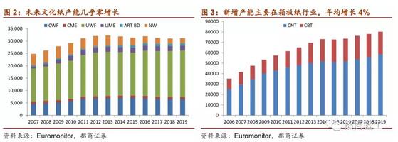 基于2019年新增產能計劃,從下圖來看,未來2年新增產能主要是箱板紙,2017年5000萬噸達到2019年5600萬噸左右,過去3年箱板紙行業需求增長一般維持在2~3%左右,其中最大的推動因素是快遞行業。我們認為,造紙行業整體供需格局依然穩健,供應壓力主要體現在包裝紙行業上,而文化紙行業新增產能幾乎為零,如果假設未來紙品需求依然穩健,未來造紙行業供需壓力無須過于擔心。