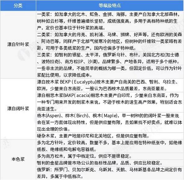 從全球的視角看,闊葉漿的產能主要集中在巴西,針葉漿的產能主要集中在美國。全球紙漿產量主要集中在北美洲、歐洲和亞洲,但是正逐漸向拉丁美洲轉移,2018年1-11月,巴西國內紙漿產量達1930萬噸,巴西紙漿產量已經超過加拿大和中國,緊隨美國之后。 而基于中國國內市場,2018年紙漿行業面臨市場壓力較大,一方面,原生漿產量下降;另一方面,受廢紙進口環保許可和進口檢驗標準約束,使得廢紙進口量驟減,原料趨緊,進而促使國內回收廢紙價格持續高位,2018年廢紙回收量并不樂觀,廢紙漿產量也受到影響。預計2019年,紙漿產業將面臨諸多挑戰。 全球紙漿行業發展現狀 紙漿類型及特點 由木材為原料,利用化學、機械或二者結合的方法制得的紙漿統稱為木漿,木漿多用于生活用紙及文化用紙領域。木漿又分為兩大類,分別是針葉漿和闊葉漿。一般針葉漿具有比闊葉漿更強的韌度與可拉伸性,因此在木漿的使用中通常會摻入一定比例的針葉漿以增強紙張韌性。 從產品類別看,化學木漿產量在紙漿中占比一般在70%以上,而化學木漿包括漂白化學木漿(漂白針葉漿、漂白闊葉漿)和未漂白化學木漿(本色漿),這三類紙漿的等級、特點和全球產地均各有不同,具體如下。 圖表1:全球主要紙漿類型及特點