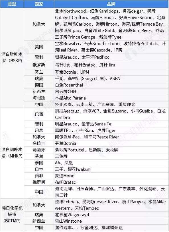 針葉漿是指由針葉樹作為原材料制成的木漿,如馬尾松、落葉松、紅松、云杉等,針葉樹多生長于中高緯度地區如北美、北歐、俄羅斯、智利等地區和國家,對應品牌種類也較多;闊葉漿是指由闊葉樹作為纖維原料制成的木漿,如樺木、楊木、椴木、桉木、楓木等,闊葉樹多生長于中低緯度地區,如美國南部、巴西、智利和印度尼西亞等地區,品牌種類也較多。此外,漂白化學機械漿主要產自加拿大、中國等。 圖表2:全球主要紙漿品牌分布情況