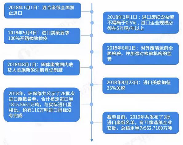 2018年,進口固體廢物的相關政策和中美貿易戰的影響貫穿全年,成為影響進口廢紙數量的最重要因素。截至目前,2019年共發布了四批進口廢紙名單,有71家造紙企業獲批,總核定量為553.682萬噸。此外,中國生態環境部表示2019年,洋垃圾入境管控將會更為嚴格,而進口廢紙自然也會被牽涉其中。 圖表9:2012-2018年中國進口廢紙量及其變化情況(單位:萬噸,%)