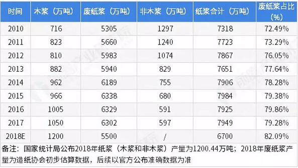 根據中國造紙協會和統計局統計的紙漿行業產量具體如下表,歷年廢紙漿產量占紙漿行業總產量比重超過70%,廢紙漿是紙漿行業的主要產品。 圖表11:2010-2018年中國紙漿行業產量及預測情況(單位:萬噸,%)