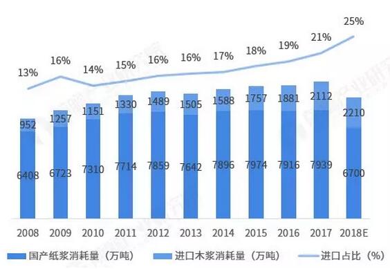 需求端:消耗量與產量同步下降,依賴國外市場 初步估算,2018年中國國產紙漿消耗量約6700萬噸(近似于2018年產量),進口木漿(扣除溶解漿)2210萬噸,紙漿消耗量與產量同步下降。 從2008-2018年中國紙漿消耗量的國產和進口比重來看,進口木漿比重整體呈增加趨勢,國內紙漿需求對進口的依賴性逐漸增強。此外,值得注意的是,國產紙漿中包含了進口廢紙制漿,通過進口廢紙在國內生產廢紙漿,這部分其實也依賴于國外市場,加上這一部分后國內紙漿需求對國外市場的依賴度超過40%。綜上,國內紙漿需求對國外市場的依賴性較強。 圖表12:2008-2018年中國國產及進口紙漿消耗量及預測值(單位:萬噸,%)