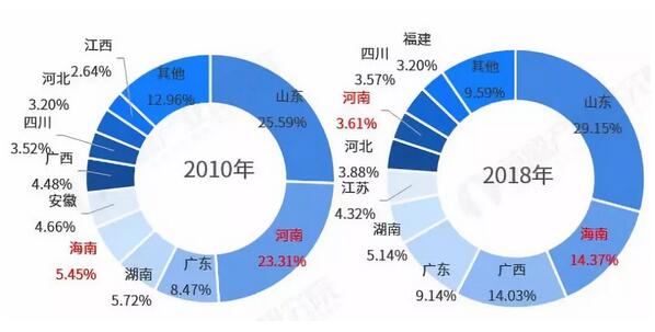 中國紙漿產業遷移路徑 原生漿生產集中在山東,部分向海南遷移 根據國家統計局統計,2018年紙漿(原生漿)產量為1200.4萬噸,排名前十地區分別為山東、海南、廣西、廣東、海南、江蘇、河北、河南、四川和福建;其中,山東省產量最高,占全國比重約30%。對比2010年和2018年發現,海南地區產量比重占比大幅提高,增長近9個百分點;而河南地區占比大幅減少,占比降低約20個百分點。原生漿的生產集中在山東地區,部分企業向海南地區遷移。 此外,部分國外企業也選擇轉移到海南。如海南金海漿紙業有限公司是金光集團APP(中國)投資建設的特大型制漿造紙企業,地處海南省洋浦經濟開發區,占地8000畝,一期工程年產100萬噸化學漂白硫酸鹽桉木漿,2005年3月28日正式投產;二期工程年產160萬噸造紙項目,均已建成投產。 圖表13:2010年與2018年中國紙漿產量排名前十地區產量份額對比(單位:%)
