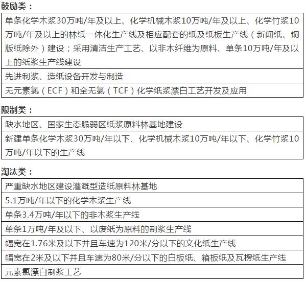 對(duì)比《產(chǎn)業(yè)結(jié)構(gòu)調(diào)整指導(dǎo)目錄(2011年本)(修正)》,鼓勵(lì)類沒有變化;限制類中去除了“新聞紙、銅版紙生產(chǎn)線”;“元素氯漂白制漿工藝”則從限制類調(diào)整到了淘汰類。