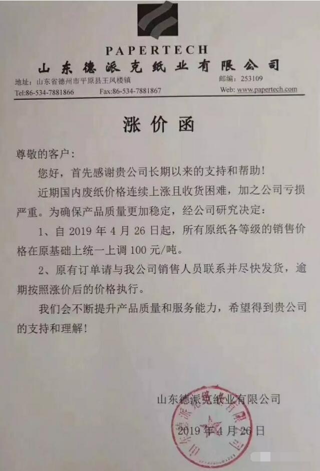 瀏陽市永泰紙業(yè)有限公司:近期由于原材料價格上漲,造成生產成本增加,此次調價從4月27日起,所有原紙在原基礎上,上調50元/噸。