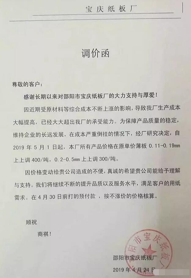 寶慶紙板廠:因近期受原材料等綜合成本不斷上漲的影響,自5月1日起,本廠所有產品價格在原單價薄板0.11-0.19mm上調400/噸,0.2-0.5mm上調300/噸。
