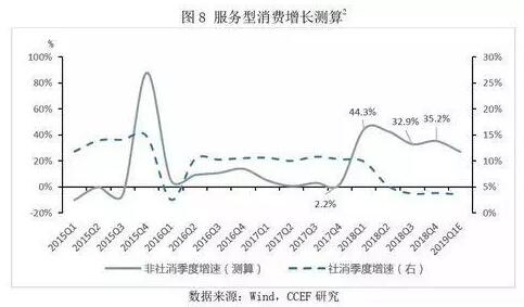 由于目前我國居民可支配收入增速顯著低于家庭債務增速,家庭債務導致持續性的還貸支出對居民消費形成長期抑制。數據顯示,尤其在2009-2011、2016年,我國家庭債務經歷了兩次大幅增長(增速約為40%)之后,社會消費品銷售總額、居民最終消費支出均出現持續增速回落的趨勢。 消費以不同方式升級 自2012年以來,社會零售總額增速就一直處于下行通道中,但最終消費對GDP增長的貢獻呈現穩步上升趨勢,原因何在?主要原因在于以教育、醫療、文化、金融中介等不包含在社會消費品零售總額的服務性消費增速顯著上升,2018年,服務型消費約增長35%,比2017年的9%增速高出26個百分點。由于這類消費升級大大抑制了社會零售總額,導致消費電子、服裝鞋帽、食品飲料等行業均出現需求下滑。