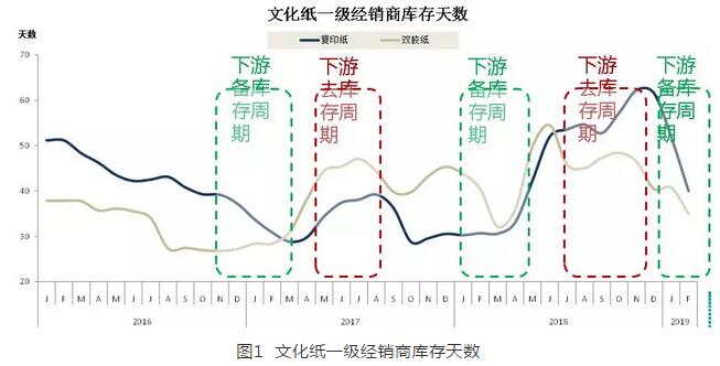 需求回升,進入新一輪備庫周期 1、傳統旺季來臨 傳統出版旺季到來,3月~4月招標全面開始,4月~6月印廠開始會陸續啟動進貨流程,教材用紙消化掉紙廠的很大一部分產能,短期內市場供應量有限,因此市場具備有漲價的可能性。 2、渠道庫存消化殆盡 經過2018年底的一輪調整,目前渠道商和終端用戶的庫存已經消化殆盡,下游去庫存的周期基本完成,將進入新一輪的備庫周期,存在補庫的剛性需求,同時紙廠也需要漲價彌補產能不足造成的損失。如圖1。