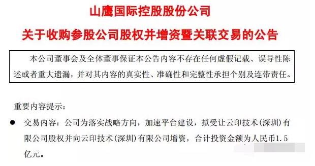 5月5日,山鷹紙業(yè)發(fā)布公告稱,為落實(shí)戰(zhàn)略方向,加速平臺建設(shè),通過受讓股權(quán)和增資共投資1.5億元,獲得云印技術(shù)(深圳)有限公司69.38%的股權(quán)。
