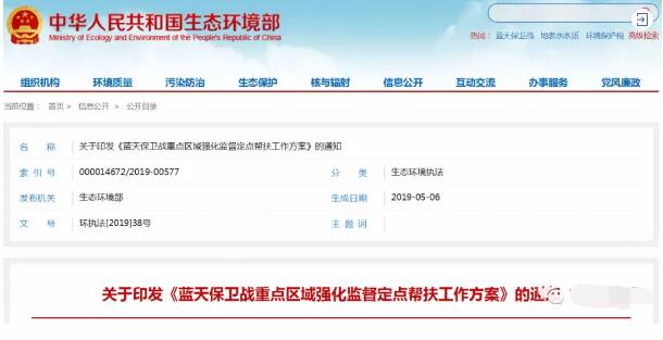 生態環境部印發《關于印發《藍天保衛戰重點區域強化監督定點幫扶工作方案》的通知》。意味著新一輪的強化監督工作于5月8日正式啟動,生態環境部派出300個左右工作組分布到京津冀及周邊、汾渭平原等重點區域的39個城市。時間安排2019 年5 月至2021 年3 月,每15 天為一個輪次;為期2年!