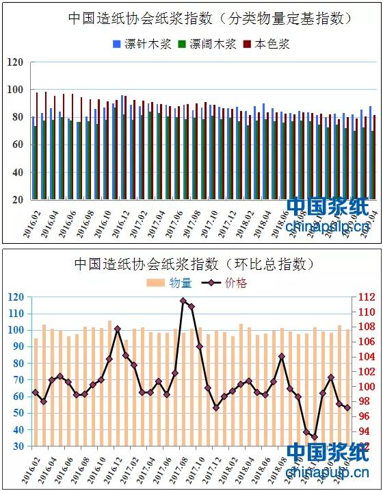 本色漿方面,4月份本色漿價格指數環比下滑3.30%至107.90點;物量指數環比上漲1.32%至81.64點,本色漿價格繼續下降。4月本色漿市場整體購銷氛圍較為清淡,需求持續疲軟,漿價延續下跌走勢,月底主流品牌金星價格5400元/噸,烏本塊3850元/噸。外盤方面,4月智利Arauco金星報價持穩,面價在710美元/噸;俄羅斯llim本色漿烏本塊價格持平上月。本月本色漿現貨市場供需兩淡,場內成交情況一般,下游紙企剛需采購,漿價整體呈窄幅下行趨勢,預計短期內本色漿現貨市場行情缺乏向好動力,漿價或將維持弱勢小幅下跌走勢。