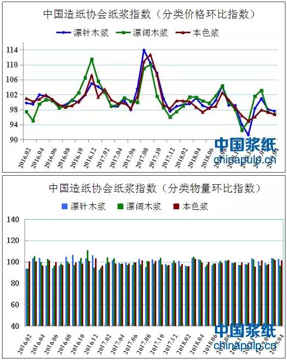4月份,紙漿市場行情表現依舊偏弱,需求暫無明顯好轉跡象,漿市詢盤氛圍清淡,受增值稅下調,且下游市場需求不足影響,漿價延續下滑趨勢。據統計,4月份中國造紙協會紙漿價格總指數環比下滑2.90%至111.94點,下跌幅度較3月相比有所擴大,物量總指數環比上漲0.58%至79.83點,其中,漂針木漿和本色漿市場成交均量減價增,漂闊木漿量價均下滑。