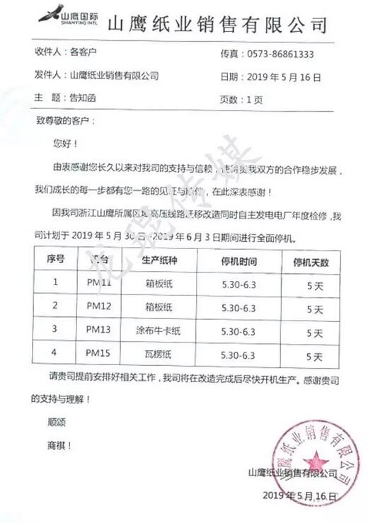 如5月16日玖龍本月第一次降價的那天,浙江山鷹就發布停機通知稱,因所屬區域高壓線路遷移改造同時自主發電電廠年度檢修,4臺紙機計劃于2019年5月30日-6月3日期間全面停機。