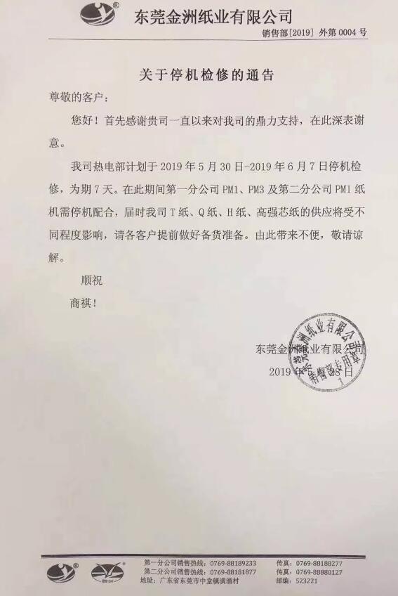 東莞金洲紙業:熱電部計劃于2019年5月30日-2019年6月7日停機檢修,為期7天。在此期間,PM1、PM3及第二分公司PM1紙機需停機,T紙、Q紙、H紙、高強芯紙的供應將受到影響。