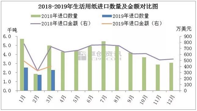圖3 如圖3所示,據(jù)海關(guān)統(tǒng)計(jì)2019年一季度中國生活用紙進(jìn)口6.58千噸,其中原紙進(jìn)口4.15千噸、成品紙進(jìn)口2.43千噸,同比減少47.45%,環(huán)比減少31.76%;進(jìn)口金額1223.55萬美元,其中原紙進(jìn)口642.93萬美元、成品紙進(jìn)口580.62萬美元,同比減少33.19%,環(huán)比減少25.82%。 觀點(diǎn): 生活用紙新項(xiàng)目產(chǎn)能的大量釋放,以及國家實(shí)施節(jié)能減排、淘汰落后產(chǎn)能等舉措,使得生活用紙市場愈發(fā)競爭激烈。受終端貿(mào)易商采購積極性不高影響,各地市場交投不暢,一季度生活用紙大軸價(jià)格變化不大,各地紙價(jià)未能走高。另外,受原料價(jià)格下滑影響,3月份以來生活用紙紙企紛紛報(bào)跌。據(jù)卓創(chuàng)資訊監(jiān)測數(shù)據(jù)顯示,5月23日生活用紙周均價(jià)下降為6682.81元/噸,較上周環(huán)比下降1.09%,同比下降992.19元/噸,跌幅12.93%。二季度屬于生活用紙下游需求淡季,進(jìn)口木漿現(xiàn)貨市場不斷下跌,對生活用紙市場暫無利好支撐,各地紙企多以觀望為主。為刺激出貨,紙企紛紛下調(diào)價(jià)格。短期來看進(jìn)口木漿外盤遲遲未明朗,現(xiàn)貨市場延續(xù)下行,對生活用紙市場暫無利好支撐,卓創(chuàng)預(yù)計(jì),近期生活用紙市場弱穩(wěn)為主。