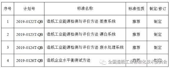 2019年6月24日,工業(yè)和信息化部發(fā)布了《關于印發(fā)2019年第一批行業(yè)標準制修訂和外文版項目計劃的通知》﹝工信廳科函(2019)126號﹞。其中,由全國造紙工業(yè)標準化技術委員會歸口管理以及中國制漿造紙研究院有限公司主要負責起草的4項節(jié)能標準位列其中,具體見下表。