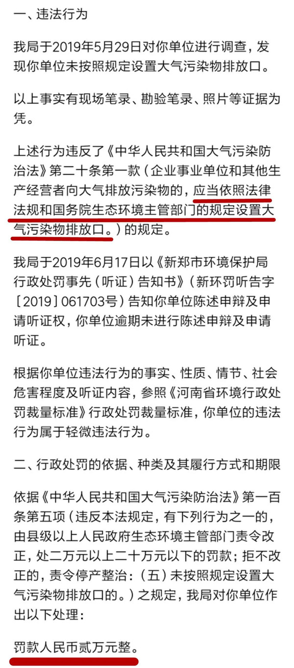 導語:環保可不是開玩笑,近年來軟包裝行業時不時發生,因環保不達標被罰款的問題。近日,鄭州金田包裝材料有限公司和四川蜀天包裝有限公司各因環保問題撞槍口被罰款!希望這一起起案例,能給軟包裝行業起到警鐘作用,不心存僥幸,嚴格遵照法律法規規定經營生產。 鄭州金田包裝 未設置大氣污染物排放口被罰款2萬元 2019年6月24日,河南省新鄭市環境保護局公布鄭州市金田包裝材料有限公司(以下簡稱“鄭州金田包裝”)處罰決定書,鄭州金田包裝因未按照規定設置大氣污染物排放口被罰款。 依據《中華人民共和國大氣污染防治法》第一百條: 違反本法規定,有下列行為之一的,由縣級以上人民政府生態環境主管部門責令改正,處二萬元以上二十萬元以下的罰款;拒不改正的,責令停產整治: (一)侵占、損毀或者擅自移動、改變大氣環境質量監測設施或者大氣污染物排放自動監測設備的; (二)未按照規定對所排放的工業廢氣和有毒有害大氣污染物進行監測并保存原始監測記錄的; (三)未按照規定安裝、使用大氣污染物排放自動監測設備或者未按照規定與生態環境主管部門的監控設備聯網,并保證監測設備正常運行的; (四)重點排污單位不公開或者不如實公開自動監測數據的; (五)未按照規定設置大氣污染物排放口的。 新鄭市環保局最終決定對鄭州金田包裝作出以下處理:罰款人民幣貳萬元整。 鄭州金田包裝應當自接到本處罰決定書之日起十五日內將罰款匯入指定銀行和賬號,逾期不繳納罰款的,新鄭市環保局將依法采取行政強制措施。 處罰決定書部分內容↓↓