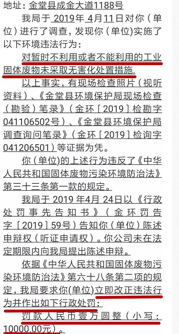 蜀天包裝 固廢未采取無害化處置措施 立即改正,受罰10000元 2019年5月24日,四川蜀天包裝有限公司被金堂縣環境保護局發現:對暫時不利用或者不能利用的工業固體廢物未采取無害化處置措施。 依據《中華人民共和國固體廢物污染環境防治法》第六十八條第二項的規定,金堂縣環境保護局要求蜀天包裝立即改正違法行為并作出如下行政處罰:罰款人民幣壹萬圓整(小寫:10000.00元) 限于接到本處罰決定之日起15日內繳至指定銀行和賬號。逾期不繳納罰款的,金堂縣環境保護局可以根據《中華人民共和國行政處罰法》第五十一條第一項規定每日按罰款數額的3%加處罰款。 處罰決定書部分內容↓↓