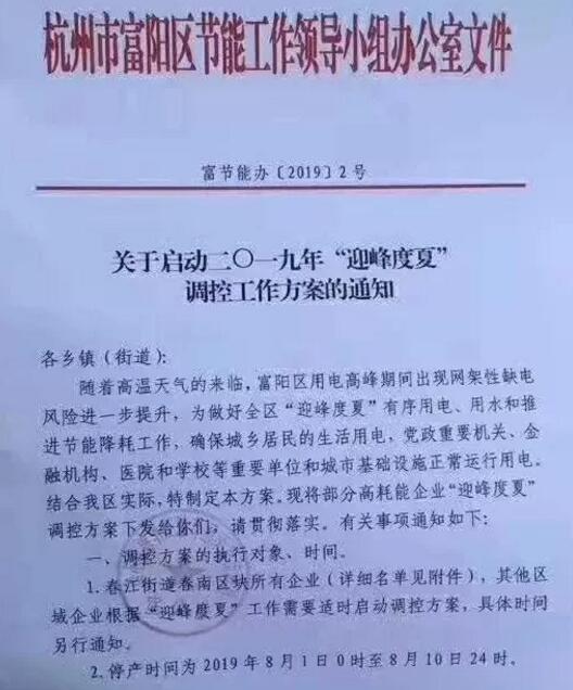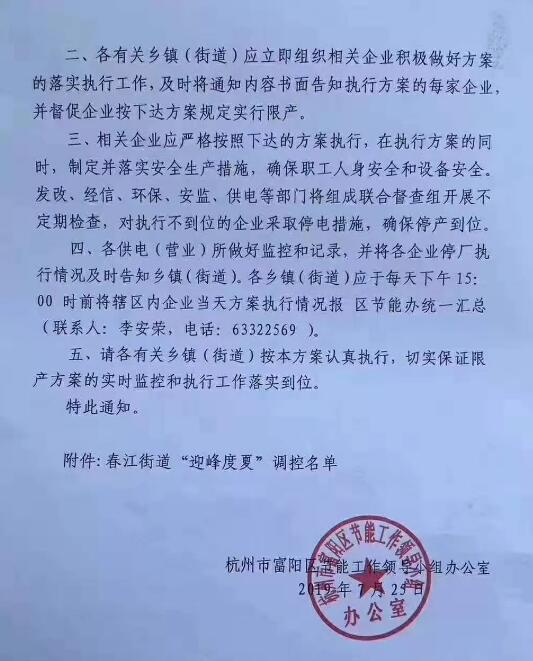 通知稱,高溫天氣的來(lái)臨,富陽(yáng)區(qū)用電高峰期出現(xiàn)網(wǎng)架性缺電風(fēng)險(xiǎn)進(jìn)一步提升,為做好“迎峰度夏”有序用電、用水和推進(jìn)節(jié)能降耗工作,確保城鄉(xiāng)居民的生活用電和城市基礎(chǔ)設(shè)施正常運(yùn)行用電,現(xiàn)下發(fā)部分高耗能企業(yè)“迎峰度夏”調(diào)控方案。 調(diào)控對(duì)象包括春江街道春南區(qū)塊所有企業(yè),而其他區(qū)域企業(yè)則根據(jù)“迎峰度夏”工作需要適時(shí)啟動(dòng)調(diào)控方案,具體時(shí)間另行通知。換而言之,春江街道的25家企業(yè)只是首批名單,后續(xù)還會(huì)有更多企業(yè)停產(chǎn): 浙江華鑫紙業(yè)有限公司 杭州富陽(yáng)茂宏紙業(yè)有限公司 杭州富陽(yáng)天鵬紙業(yè)有限公司 浙江文豐紙業(yè)有限公司 杭州藍(lán)鳥(niǎo)紙業(yè)有限公司 浙江恒昇紙業(yè)有限公司 浙江涌金紙業(yè)有限公司 杭州富陽(yáng)永樂(lè)紙業(yè)有限公司 杭州富陽(yáng)陽(yáng)光紙業(yè)有限公司 杭州富陽(yáng)新城紙業(yè)有限公司 杭州三星紙業(yè)有限公司 杭州富陽(yáng)慶豐紙業(yè)有限公司 浙江萬(wàn)眾紙業(yè)股份有限公司 浙江三星紙業(yè)股份有限公司 杭州大眾紙業(yè)有限公司 杭州富陽(yáng)恒昇紙業(yè)有限公司 浙江道勤紙業(yè)有限公司 杭州富陽(yáng)盈泰紙業(yè)有限公司 浙江華茂紙業(yè)有限公司 杭州華勝紙業(yè)有限公司 杭州富陽(yáng)天地紙業(yè)有限公司 杭州富陽(yáng)富亨紙業(yè)有限公司 杭州遠(yuǎn)大紙業(yè)有限公司 杭州頂點(diǎn)紙業(yè)有限公司 杭州富陽(yáng)方圓紙業(yè)有限公司