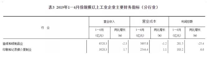 其中,造紙和紙制品業1-6月份的營業收入為6528.3億元,同比減少2.3%;營業成本為5695.8億元,同比減少1.2%;利潤總額為281.5億元,同比減少25.4%。