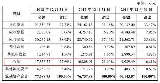 報告期內,大勝達存貨金額分別為1.05億元、9989.49萬元、1.68億元、1.76億元,占流動資產比重分別為15.64%、16.61%、21.90%、22.60%。
