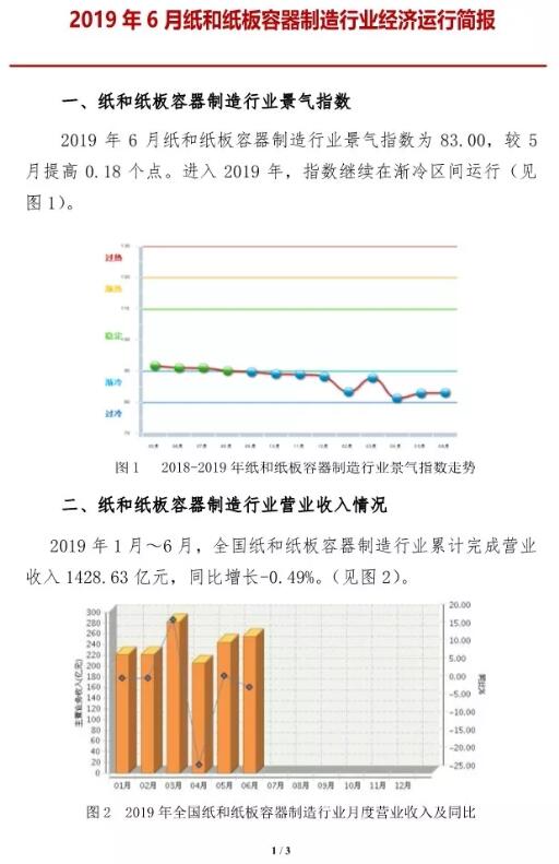 8月26日,中國包裝聯合會發布了2019年紙和紙板容器制造行業經濟運行簡報。據顯示,今年1-6月,全國紙和紙板容器制造行業完成營收1428.63億元,同比下降0.49%。其中: