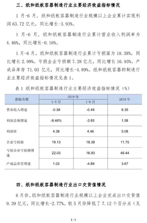 1-6月,紙和紙板容器制造行業累計營業收入利潤率為4.46%,同比下降0.16%;