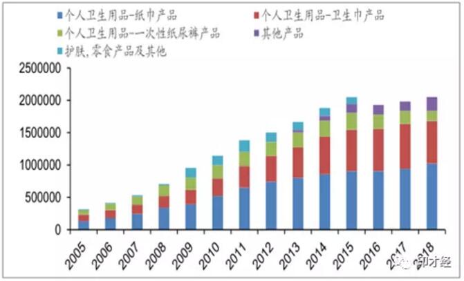 恒安國際:從衛(wèi)生巾單一品類拓展至衛(wèi)生巾、紙尿褲、生活用紙三大個(gè)人衛(wèi)生產(chǎn)品的布局。并通過收并購方式完成向化妝品、食品等領(lǐng)域外延拓展:1996年推出“安兒樂”嬰兒人紙尿褲業(yè)務(wù);1997年進(jìn)軍生活用紙行業(yè),在湖南常德投資設(shè)立“恒安紙業(yè)”;1998年在香港聯(lián)交所上市;2002年收購吉安麗人堂日化公司,生產(chǎn)經(jīng)營化妝及洗滌用品,開啟第四條產(chǎn)品線;2008年2.6億港元收購親親食品51%權(quán)益(2016年拆分)。與此同時(shí)公司治理由粗放式家族管理向現(xiàn)代化管理制度演變,支持企業(yè)進(jìn)一步發(fā)展。 恒安國際分產(chǎn)品營業(yè)收入(萬元)