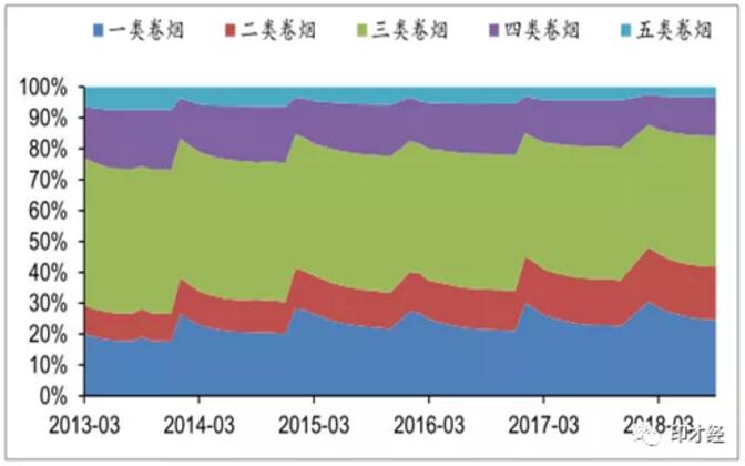 下游煙草產(chǎn)品結(jié)構(gòu)變化,中高端、創(chuàng)新產(chǎn)品占比提升。2016年,煙草銷量下滑中,經(jīng)典款銷量增長動(dòng)力略顯不足。以高端卷煙“中華”品牌為例,“中華”香煙2016年銷量134.97萬箱,同比減少18.46萬箱,下滑約12%。主要原因是新品大量發(fā)布、提稅順價(jià)過程中,經(jīng)典品牌的配套維護(hù)措施不到位。2017年,煙草公司前期發(fā)布的新品逐步取得成效,同時(shí)創(chuàng)新產(chǎn)品貢獻(xiàn)增量。配合去庫存的階段性成果,產(chǎn)品結(jié)構(gòu)優(yōu)化轉(zhuǎn)變推動(dòng)了2017-2018年煙草行業(yè)銷量的回暖。 新品推出力度加強(qiáng):根據(jù)中國煙草總公司披露的數(shù)據(jù),自2012年至2017年7月,煙草行業(yè)供給上市615款新品。其中,2016、2017年分別上市171個(gè)、148個(gè)新品,相比于2012-2015的年均新品上市數(shù)實(shí)現(xiàn)翻番。2)新品中高端化:根據(jù)中國煙草總公司披露的數(shù)據(jù),2012年至2017年7月,上市新品多集中在中一類、普一類、二類等價(jià)區(qū),數(shù)量分別是155、126、140個(gè)。此外,超一類價(jià)區(qū)新品(每條零售價(jià)近千元)數(shù)量達(dá)到72個(gè)。1)我國煙草銷量結(jié)構(gòu)中,一類、二類煙占比不斷提升。截止2018年9月,一、二類煙占比25%、17%,而2013年9月一、二類煙占比僅有18%、9%。2)煙草每箱銷售單價(jià)也在不斷提升,2013年箱均2.5萬元左右逐年提升至3萬元以上。 我國煙草銷量結(jié)構(gòu)