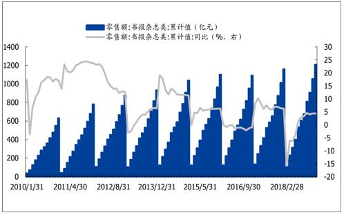 數(shù)據(jù)來源:公共資料整理 4.預計未來需求增長平穩(wěn),供求保持平衡狀態(tài)。 文化紙終端對應圖書印刷、教材出版、辦公用紙等需求,需求較為穩(wěn)定。雜志類社零額維持較為穩(wěn)定的低個位數(shù)增長,2015~2018年CAGR為3.1%,2018年增速雖較2017年有所放緩,但仍有4.3%的增長。2018年宏觀經(jīng)濟承壓,雙膠/銅版紙表觀需求量增速下滑至2.6%/1.2%,但仍維持正增長,預計未來仍維持個位數(shù)增長,因此預計未來文化紙供求維持平衡。 2018年書報雜志類社零額同比增長4.3%