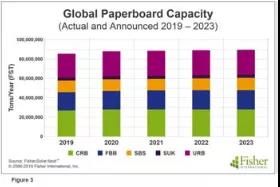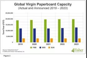 縱觀塑料飲料杯,用紙張替代全球10%的塑料杯,估計需要588,000噸杯子,比2019年全球產能350萬噸增加18%。目前,2019年之后沒有新的杯子產能宣布。 如果我們計算在美國和歐洲可能的替換塑料包裝,因為公眾對塑料廢物的關注仍在繼續,Fisher估計,用紙替代5%的塑料將消耗150萬噸紙。假設這一新產品是紙板(用于食品和飲料),圖2顯示這些品種在未來五年內實際和宣布的全球產能總量僅增加180萬噸。如果更廣泛地考慮紙板,包括回收品種,那么SmithersPira預計,到2022年,包裝紙板的需求將每年增長4%。
