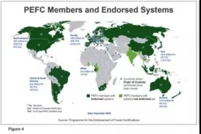 那么支持從塑料包裝轉換所需的纖維呢? 據國際模塑纖維協會報道,除紙板外,模塑纖維包裝在過去兩年中穩步增長。食品服務項目和許多消費者和家庭產品包現在用可生物降解的模塑纖維而不是塑料制成。隨著模塑纖維制造技術的進步,成本降低和性能改進將允許更多的包裝轉換成模制纖維,使用原始紙漿和再生紙漿。在競爭激烈的市場中,這將如何影響紙漿定價? 03、可持續纖維供應的影響 為了滿足紙張和紙漿,而非塑料需求的增加,可能需要對新產能進行資本投資。最可能的地區是具有良好纖維資源的區域,例如北歐國家、拉丁美洲、俄羅斯和北美。與纖維供應相關的另一個考慮因素是蘋果和三星等公司打算從森林管理委員會(FSC)和森林認證認可計劃(PEFC)等組織定義的可持續管理森林中采購包裝材料。 圖4顯示了擁有PEFC/PEFC認證森林成員的國家(陰影部分)包括全球3.09億公頃森林,但在一些地區,只有不到一半的林地獲得認證,并且不會被認為可持續/可再生的公司從負責任管理的森林。這一要求將對環保包裝的纖維供應造成額外壓力。