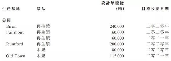 預計所有造紙計劃完成后,本集團造紙總設計年產能將于二零二一年年底前達到1,812萬噸。 6、拓寬原料來源,自產再生漿,更好地掌控原料供應的穩定性、生產質量與成本效益; 進口廢紙配額政策出臺減少原料供應,預計國廢回收量未能完全滿足市場需求,廢紙供應的缺口對造紙行業的影響不容忽視。憑借我們多年穩健之企業優勢,本集團未雨綢繆,積極拓寬國廢采購管道,密切監察國廢質量。與此同時,我們已有周詳的造漿投產計劃,特別希望透過加強上游再生漿產能,更好地掌控原料供應的穩定性、生產質量與成本效益。 7、2021年底前,集團造漿(木漿及再生漿)總設計年產能將達161萬噸; 截至二零一九年六月三十日止,本集團造漿(木漿及再生漿)總設計年產為37萬噸。我們在美國Old Town廠房進行了一系列的設備升級改造,并于二零一九年八月起生產本色針葉木漿,其年產能達16萬噸。本集團于九月在馬來西亞收購一間公司,其再生漿年產能為48萬噸。目前,本集團造漿(木漿及再生漿)總設計年產為85萬噸。我們計劃在二零二一年年底前,于美國現有漿紙廠再增加56萬噸再生漿年產能及20萬噸木漿年產能。最新造漿(木漿及再生漿)投產計劃明細如下: