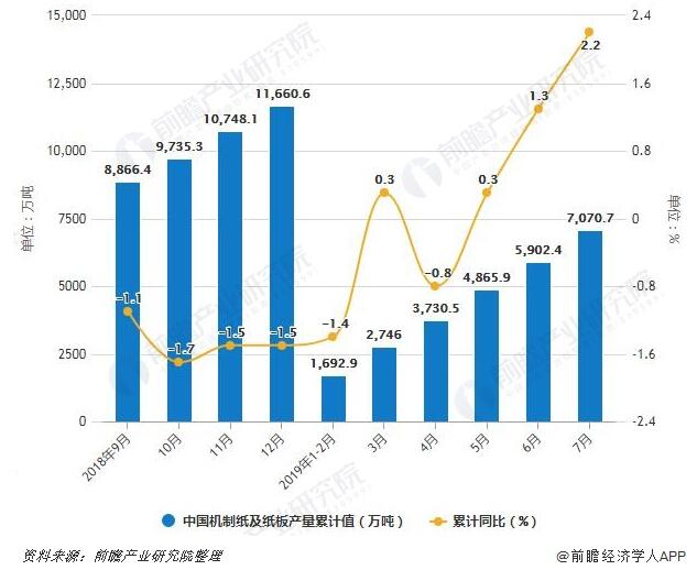 2018-2019年7月中國機制紙及紙板產量統計及增長情況