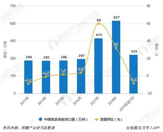 2013-2019年前7月中國紙及紙板(未切成形的)進口量、金額統計及增長情況