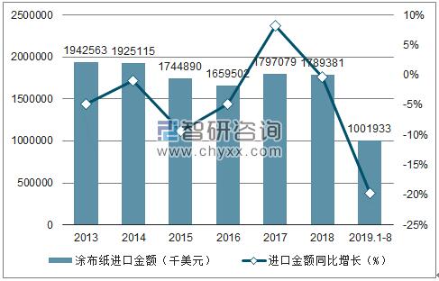2013-2019年8月中國涂布紙進口金額趨勢圖