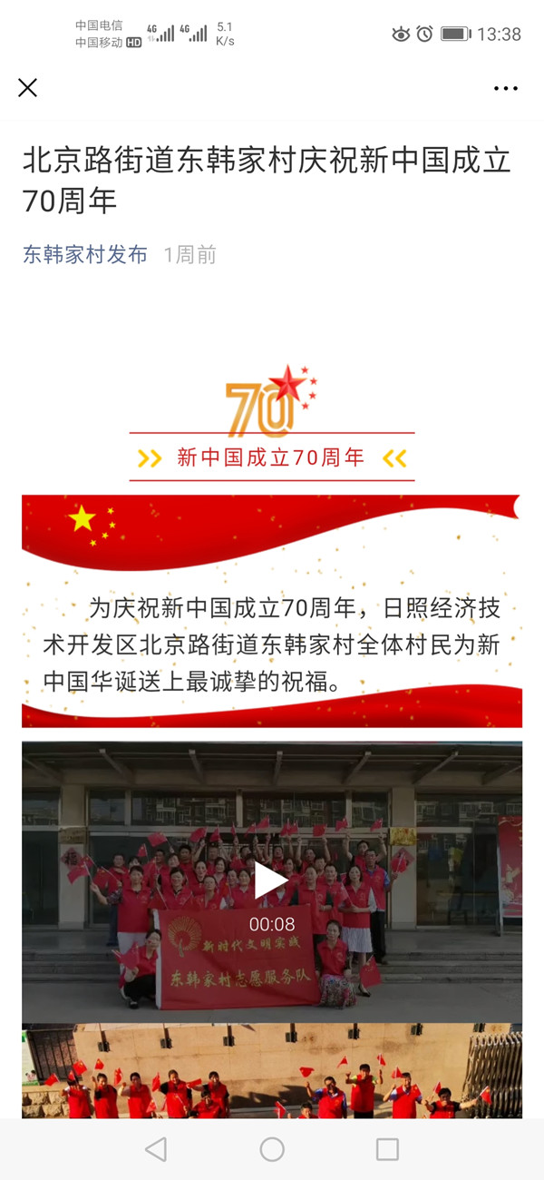 9月30日,在新中國成立70周年紀(jì)念日前一天,日照經(jīng)濟技術(shù)開發(fā)區(qū)北京路街道東韓家村的微信公眾號“東韓家村發(fā)布”以圖、文和視頻多媒體結(jié)合的形式發(fā)出了該村的第一條推送內(nèi)容《北京路街道東韓家村慶祝新中國成立70周年》。