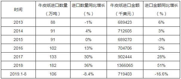 根據中國海關數據顯示:2019年1-8月中國牛皮紙進口數量為106萬噸,同比下降8.4%;2019年1-8月中國牛皮紙進口金額為719403千美元,同比下降16.6%。