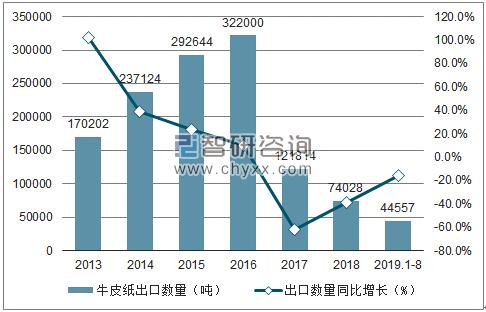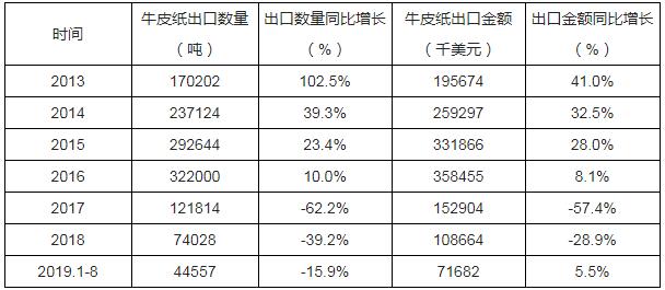 根據中國海關數據顯示:2019年1-8月中國牛皮紙出口數量為44557噸,同比下降15.9%;2019年1-8月中國牛皮紙出口金額為71682千美元,同比增長5.5%。