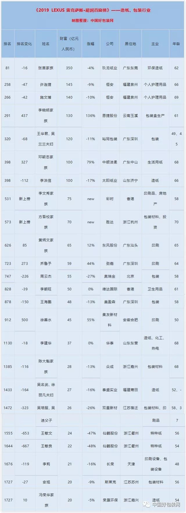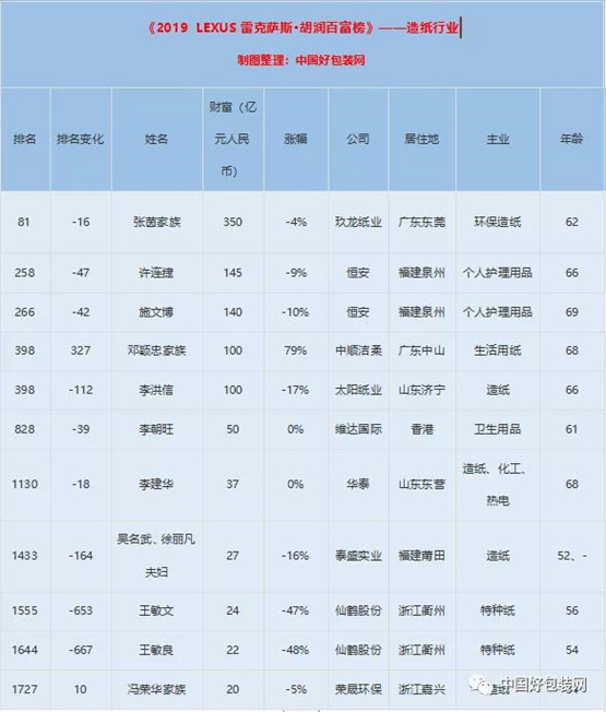 張茵家族依舊是造紙業首富 與包裝印刷行業密切相關的造紙業中,共有11人(家族)上榜。玖龍紙業的張茵家族依舊排名造紙業第一,財富達350億元,位列百富榜第81位。緊隨其后的是為來自恒安的許連捷和施文博,在造紙業分別排名第二和第三,在百富榜中分別位列第145位和第140位。 財富達到百億元以上的除了以上三位,還有來自中順潔柔的鄧穎忠家族與來自太陽紙業的李洪信。值得一提的是,鄧穎忠家族與李洪信的財富大致相等,均為一百億元,年齡也相差無幾,分別是68歲和66歲。 在排名變化方面,鄧穎忠家族上升最快,在百富榜中上升了327位,其次為來自榮晟環保的馮榮華家族,在百富榜中上升了10位。其余人(家族)在百富榜中的排名,相比去年均有所下降,其中來自仙鶴股份的王敏文和王敏良更是分別降低了653位和667位。 在本次的榜單中,除了張茵家族、馮榮華家族,幾乎就很難再找到來自包裝紙行業的企業家。上榜最多的是生活用紙行業的企業家,如來自恒安的許連捷和施文博,來自中順潔柔的鄧穎忠家族,來自維達國際的李朝旺。