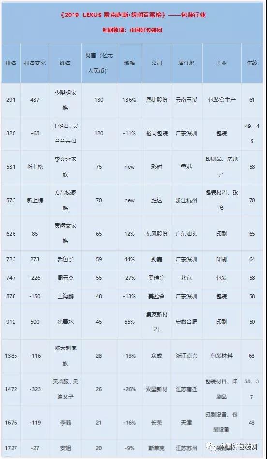 包裝印刷行業共有13人(家族)上榜 在包裝印刷行業,共有13人(家族)上榜。其中,來自恩捷股份的李曉明家族,來自裕同科技的王華君、吳蘭蘭夫婦,財富均在百億人民幣以上,占據業內財富榜單的前兩名,在百富榜中分別排名第291位和320位。 而業內排行第三的是來自彩時的李文秀家族,這是今年新上榜的家族,財富為75億元,在百富榜中排名第531位。同樣新上榜的方吾校家族在業內排行第四,來自勝達集團,財富為70億元,在百富榜中排名第573位。 在排名變化方面,集友新材料的徐善水上升幅度最大,在百富榜中上升了500位;其次為李曉明家族,在百富榜中上升了437位。而來自勁嘉股份的喬魯予則上升了273位,以59億元的財富在業內榜單中排名第六。 具體在包裝印刷行業的各領域中,紙包裝、軟包裝、金屬包裝領域均有人(家族)上榜。而在紙包裝領域,裕同科技的王華君、吳蘭蘭夫婦,勝達集團的方吾校家族,美盈森的王海鵬在榜單之中。如果再算上以煙包為主的恩捷股份、東風股份和勁嘉股份,那么百富榜中共有6家紙包裝企業的企業家上榜。