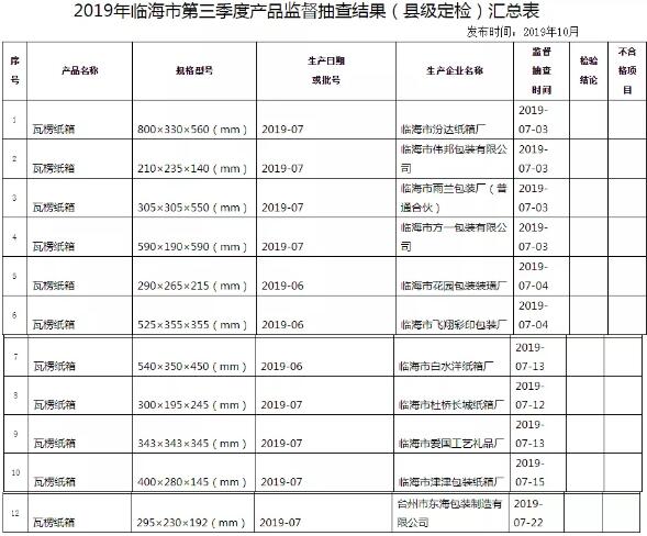 臨海市 近期,根據《中華人民共和國產品質量法》、《浙江省產品質量監督條例》的規定,臨海市市場監督管理局組織開展了全市第三季度縣級定期產品監督抽查,其中包括11家紙包裝企業的瓦楞紙箱產品,情況如下: