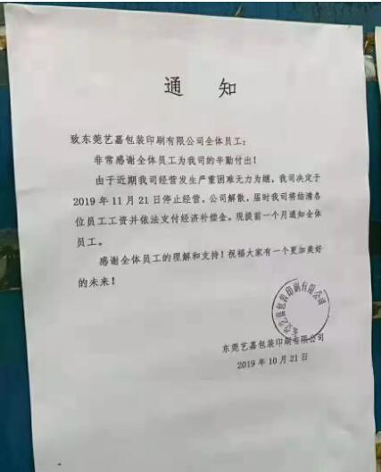 致東莞藝嘉包裝印刷有限公司全體員工: 非常感謝全體員工為我司的辛勒付出,由于近期我司經營發生嚴重困難無力為繼,我司決定于2019年11月21日停止經營,公司解散,屆時我司將結清各位員工工資并依法支付經濟補償金。現提前一個月通知全體員工。 感謝全體員工的理解和支持! 祝福大家有一個更加美好的未來! 東莞藝嘉包裝印刷有限公司 2019年10月21日