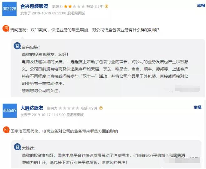 距離雙十一電商狂歡節(jié)尚有半個(gè)月時(shí)間,可隨著預(yù)售活動(dòng)的開啟,各電商平臺(tái)的相關(guān)活動(dòng)已經(jīng)開跑。而這也使得商家提前備貨,導(dǎo)致紙箱需求得到較大提升,不少紙箱廠早在10月中旬便開始涌入大量訂單。與此同時(shí),業(yè)內(nèi)幾家上市企業(yè),如合興包裝、大勝達(dá)等也都在互動(dòng)平臺(tái)上收到投資者有關(guān)雙十一活動(dòng)的提問(wèn):