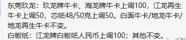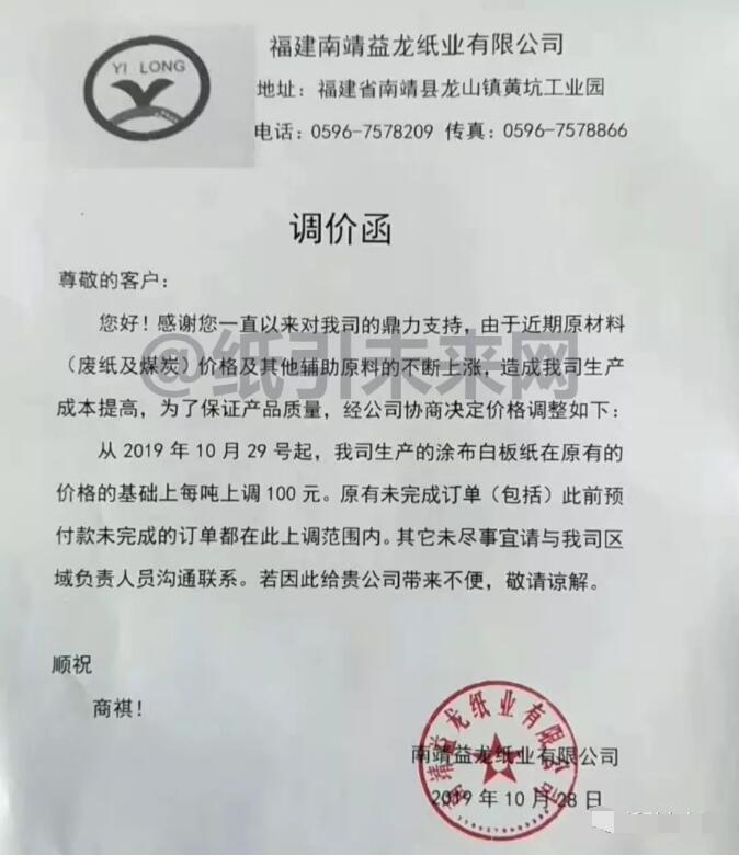 南靖益龍紙業(yè):由于近期原材料(廢紙及煤炭)價(jià)格及其他輔助原料的不斷上漲,經(jīng)公司協(xié)商決定價(jià)格調(diào)整如下:從2019年10月29號(hào)起,我司生產(chǎn)的涂布白板紙?jiān)谠械膬r(jià)格基礎(chǔ)上每噸上調(diào)100元。