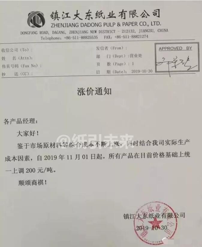 東莞玖龍:自11月1日起,玖龍牌牛卡、海龍牌牛卡上調(diào)100元/噸;江龍?jiān)偕?ㄉ险{(diào)50元/噸;芯紙48/50克上調(diào)50元/噸;白板紙:江龍牌白板紙上調(diào)100元/噸; 按照當(dāng)前的局勢(shì),11月份后,包裝紙價(jià)可能還會(huì)繼續(xù)上漲,而下游紙箱廠由于原紙價(jià)格的上漲以及雙十一帶動(dòng)的需求上升,漲勢(shì)或?qū)⒊掷m(xù)。以下為市場(chǎng)最新的原紙漲價(jià)函: 鎮(zhèn)江大東紙業(yè):鑒于市場(chǎng)原材料等綜合成本不斷上漲,同時(shí)結(jié)合我司實(shí)際生產(chǎn)成本因素,自2019年11月01日起,所有產(chǎn)品在目前價(jià)格基礎(chǔ)上統(tǒng)一上調(diào)200元/噸。